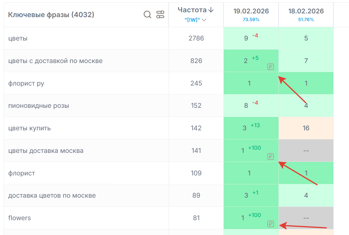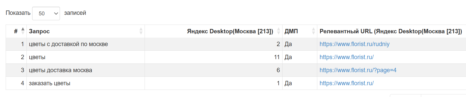 - Если ваш сайт уже участвует в показах в блоке ДМП, в таблице результатов рядом с позицией появится иконка ₽ — это означает, что сайт был найден в этом блоке.