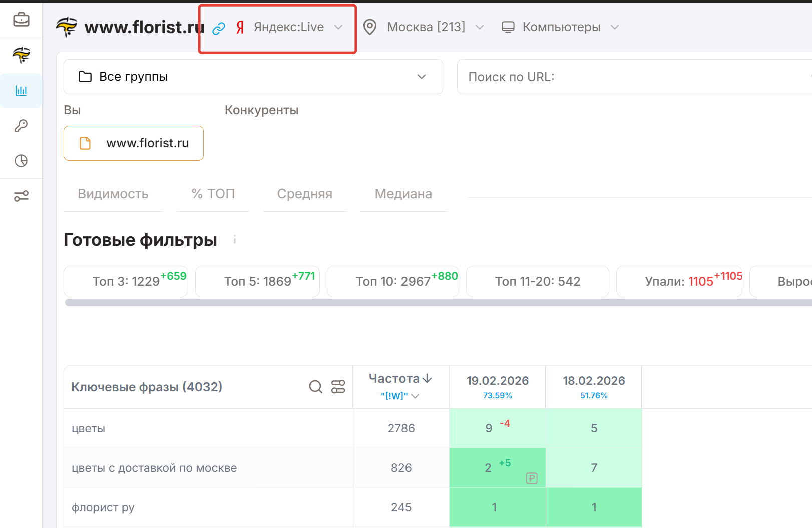 Создайте проект в сервисе мониторинга позиций: https://arsenkin.ru/projects/add. При добавлении поисковых систем выберите Яндекс:Live.