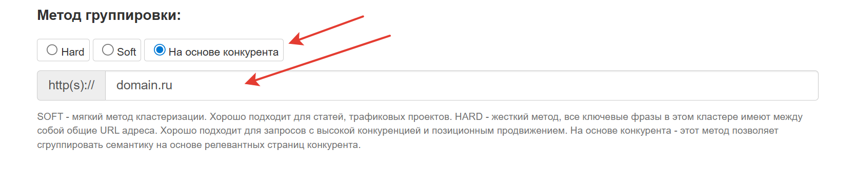 На основе конкурента - этот метод позволяет сгруппировать семантику на основе релевантных страниц конкурента.