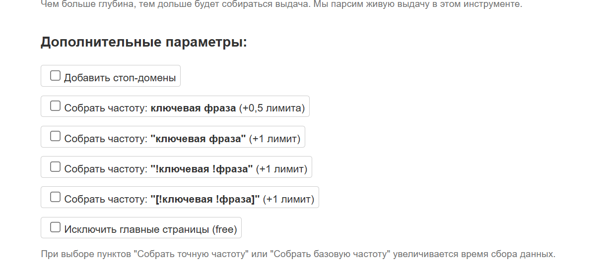- Собрать точную частоту для ключевой фразы (общая частота собирается по умолчанию для выбранного региона). +1 лимит за каждый запрос.