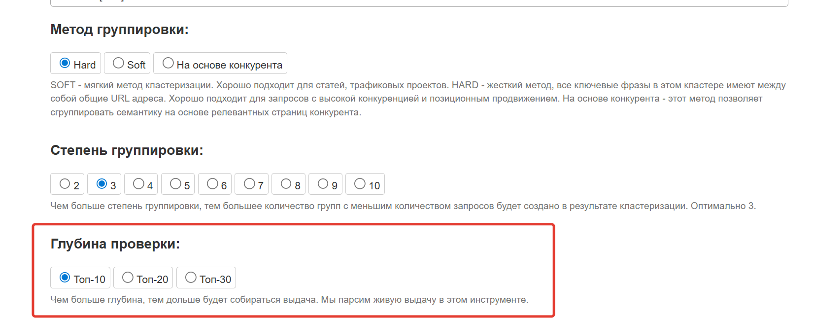 6) Глубина проверки — выбирается глубина выдачи для анализа. На выбор можно проверить ТОП-10, ТОП-20, ТОП-30. По-умолчанию установлено значение – ТОП-10.