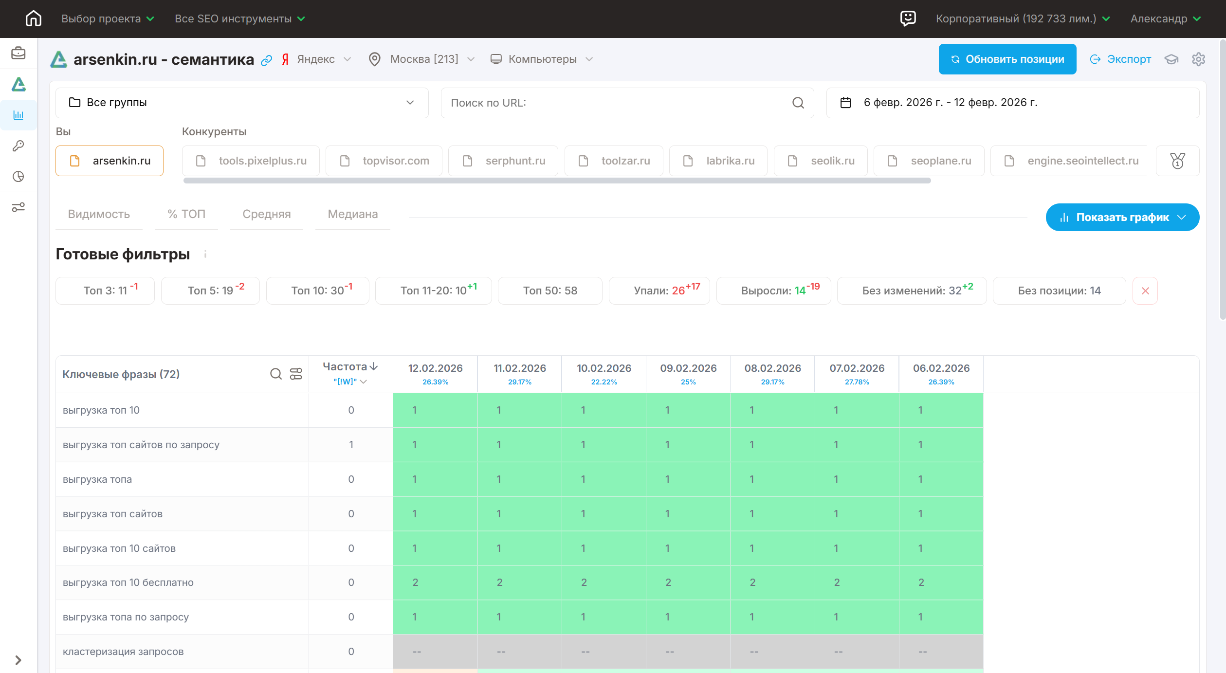 - выбрать разные метрики для анализа: Видимость, % ТОП, Средняя позиция (будут ещё добавляться)