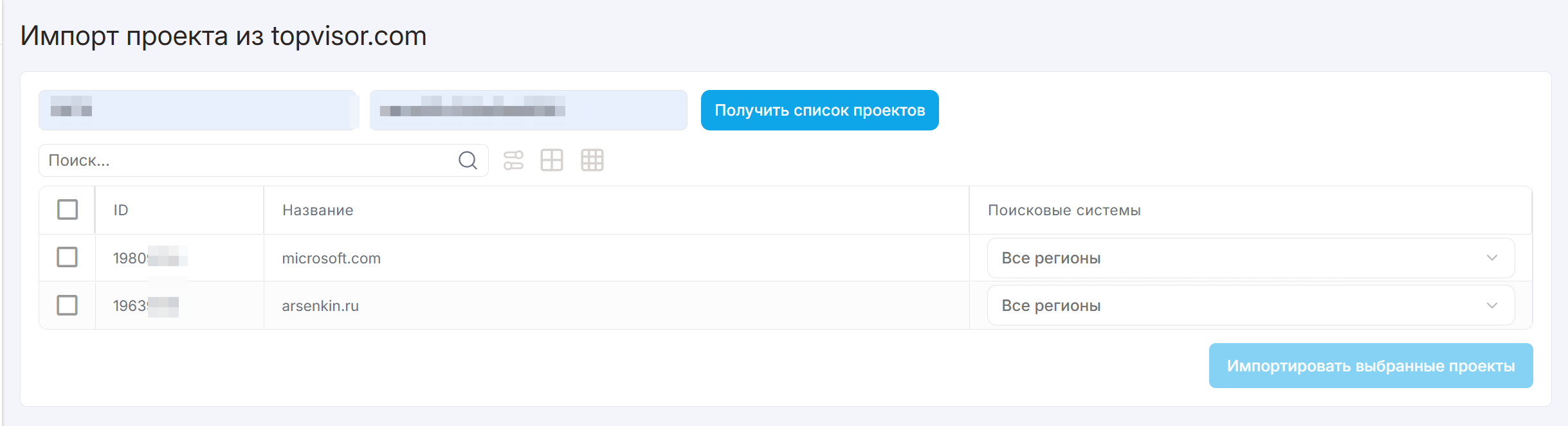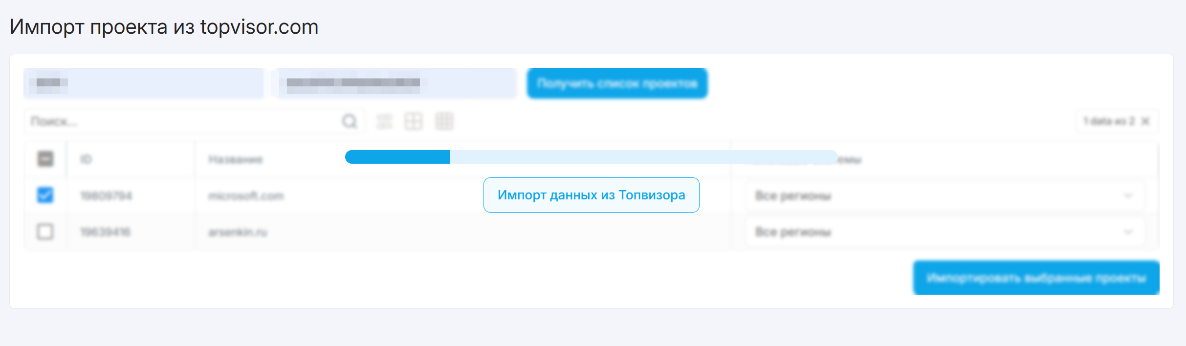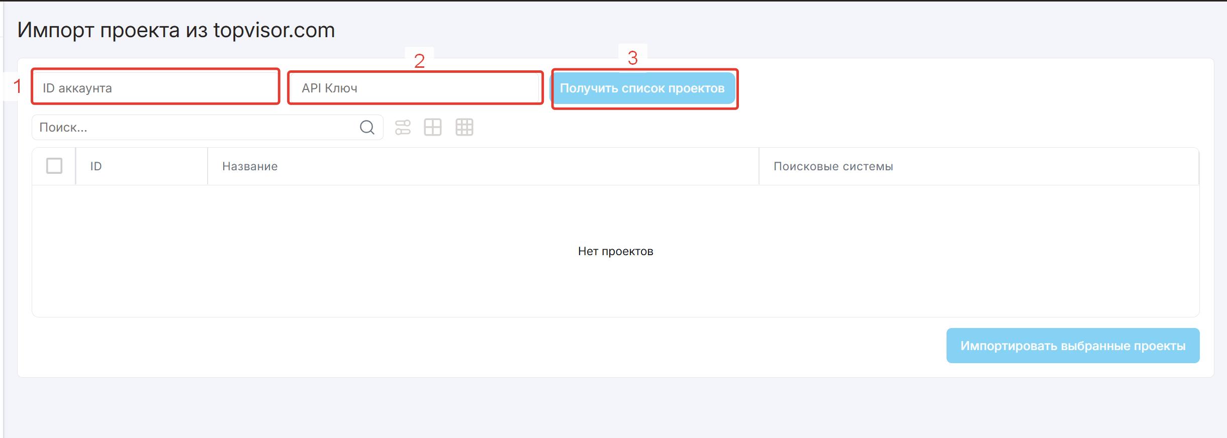 В модуле ведения проектов доступна функция импорта данных из сторонних сервисов проверки позиций. В этой инструкции рассмотрим пример переноса проектов из сервиса Топвизор.