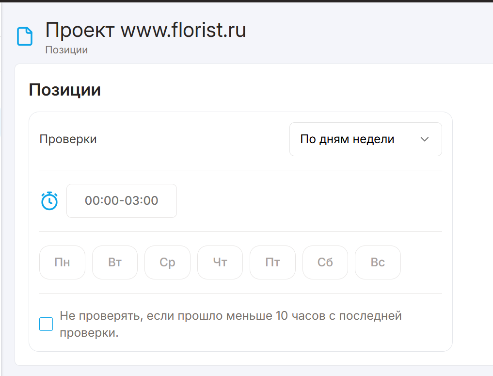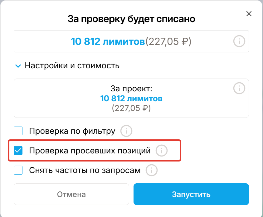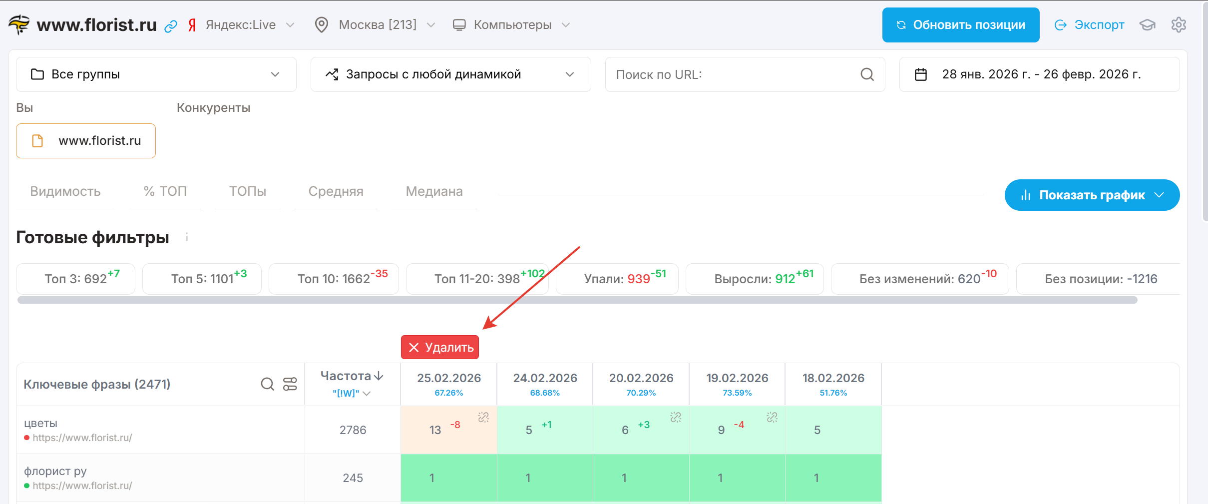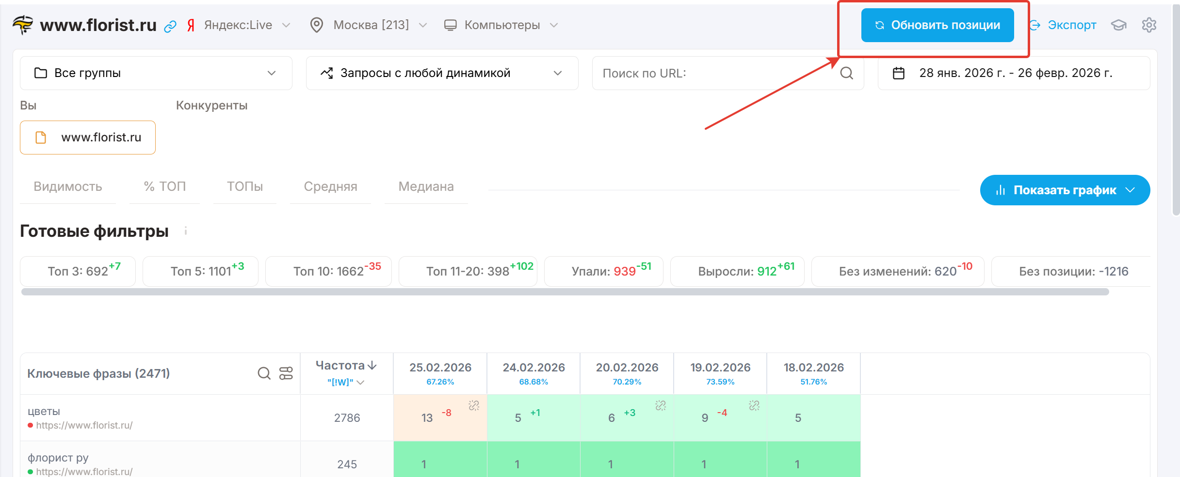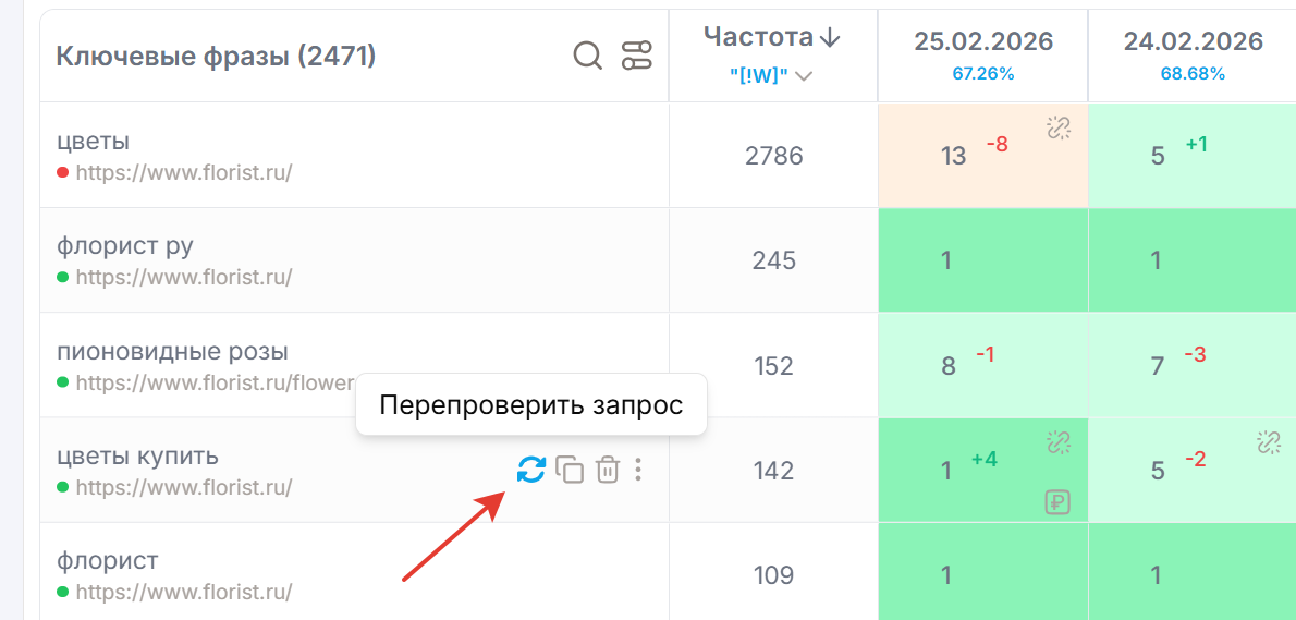 Опция позволяет повторно проверить позиции по ключевым фразам, которые показали снижение в последнем съёме.