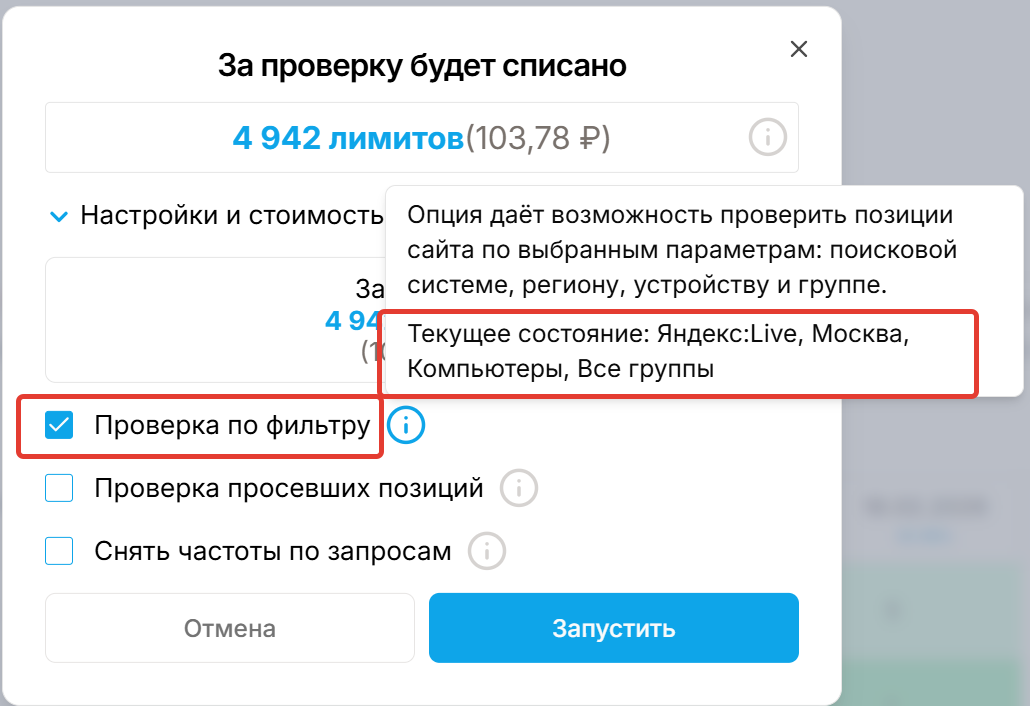 - Во всплывающем окне раскройте «Настройки и стоимость», установите чекбокс «Проверка по фильтру». Наведите на иконку получения информации, вы там увидете какие параметры выбраны.