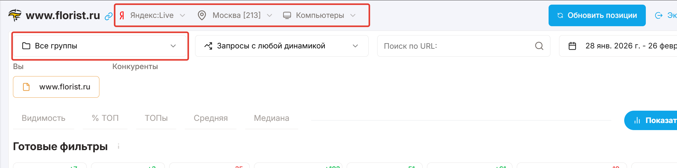 - На панели фильтров выберите нужные поисковую систему, регион, устройство и группу.
