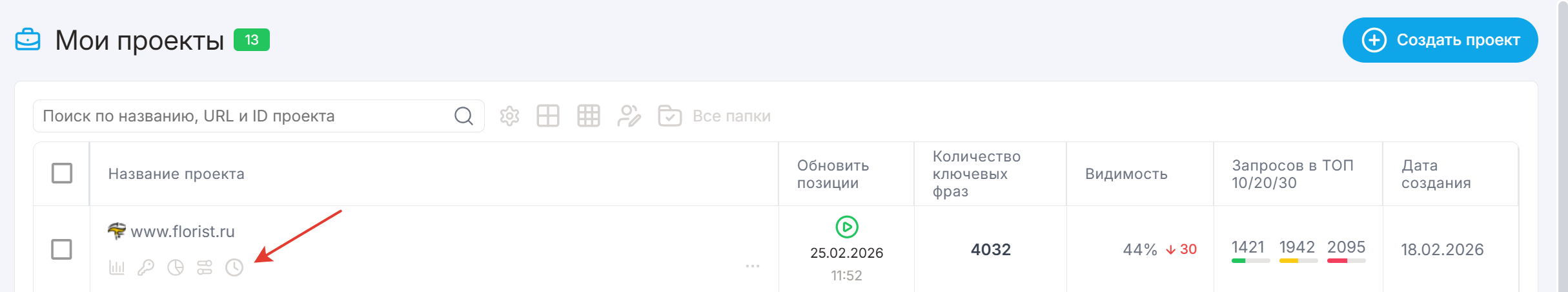 - В таблице с ключевыми фразам наведите курсор на запрос и нажмите на иконку обновления: