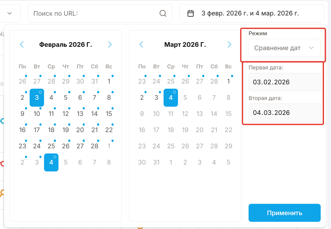 Сравнение позиций по датам позволяет увидеть, как изменились позиции ключевых фраз между двумя выбранными проверками. Выберите начальную и конечную дату, чтобы сравнить результаты и определить, по каким фразам позиции выросли, снизились или не изменились.