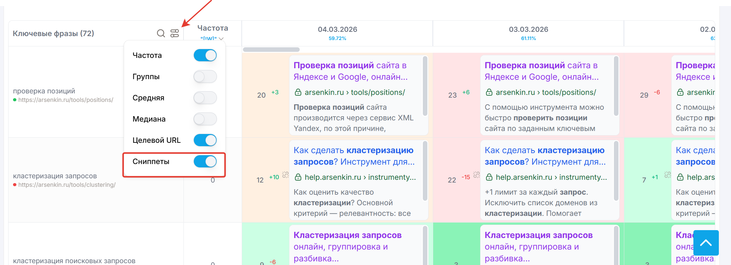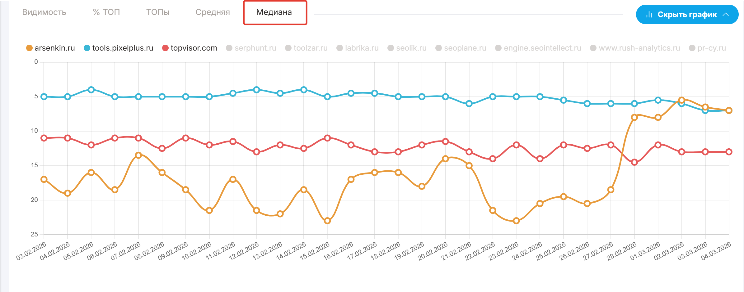 Данные можно увидеть на графиках и в таблице позиций. В настройках нужно вкллючить отображение столбца "Медиана".