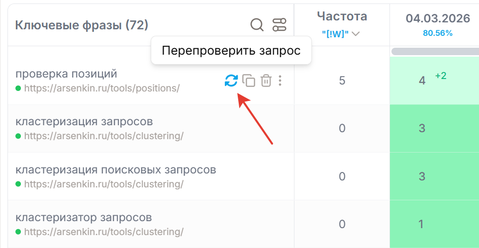 Добавлена возможность снять позицию по 1 ключевой фразе - теперь можно выполнить разовую проверку конкретной ключевой фразы без запуска общей проверки проекта. Это удобно, если нужно быстро посмотреть текущую позицию по одному запросу, перепроверить результат после изменений или уточнить данные для клиента.